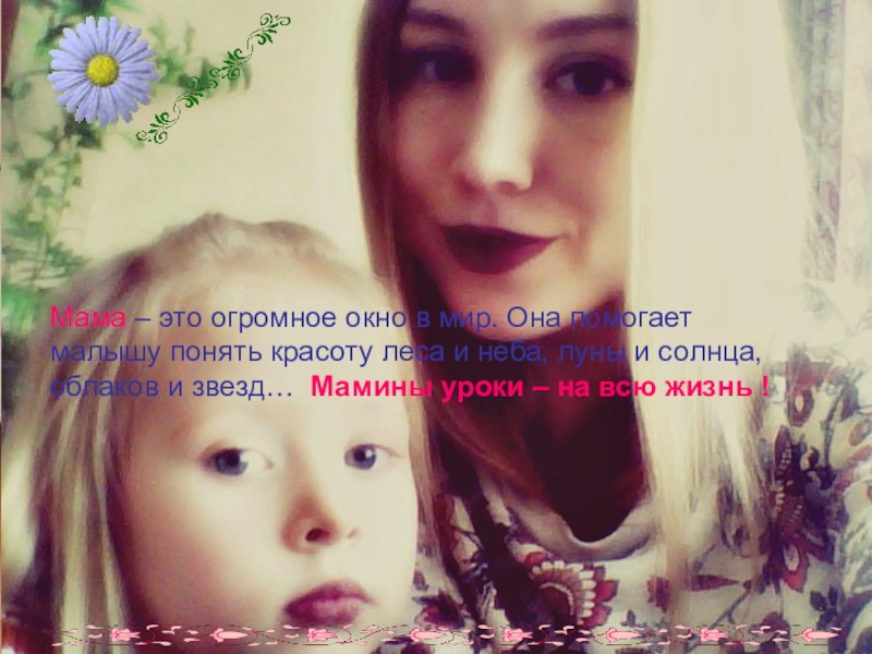 Мама – это огромное окно в мир. Она помогает малышу понять красоту леса и неба, луны и солнца, облаков и звезд… Мамины уроки – на всю жизнь !