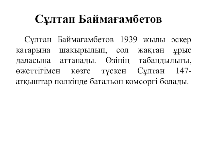 Сұлтан Баймағамбетов  Сұлтан Баймағамбетов 1939 жылы әскер қатарына шақырылып, сол жақтан ұрыс даласына аттанады. Өзінің табандылығы,