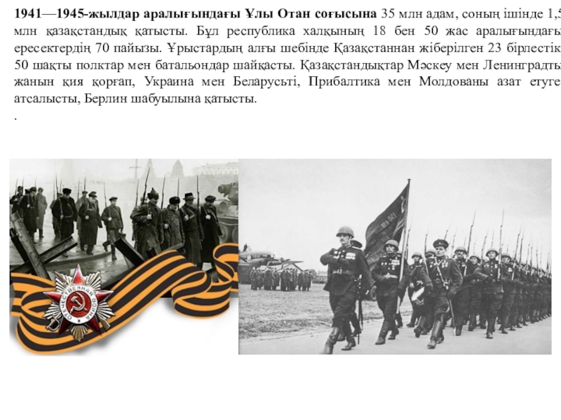 млн қазақстандық қатысты. Бұл республика халқының 18 бен 50 жас аралығындағы ересектердің 70 пайызы. Ұрыстардың алғы шебінде Қазақстаннан жіберілген 23 бірлестік, 50 шақты полктар мен батальондар шайқасты. Қазақстандықтар Мәскеу мен Ленинградты жанын қия қорғап, Украина мен Беларусьті, Прибалтика мен Молдованы азат етуге атсалысты, Берлин шабуылына қатысты.