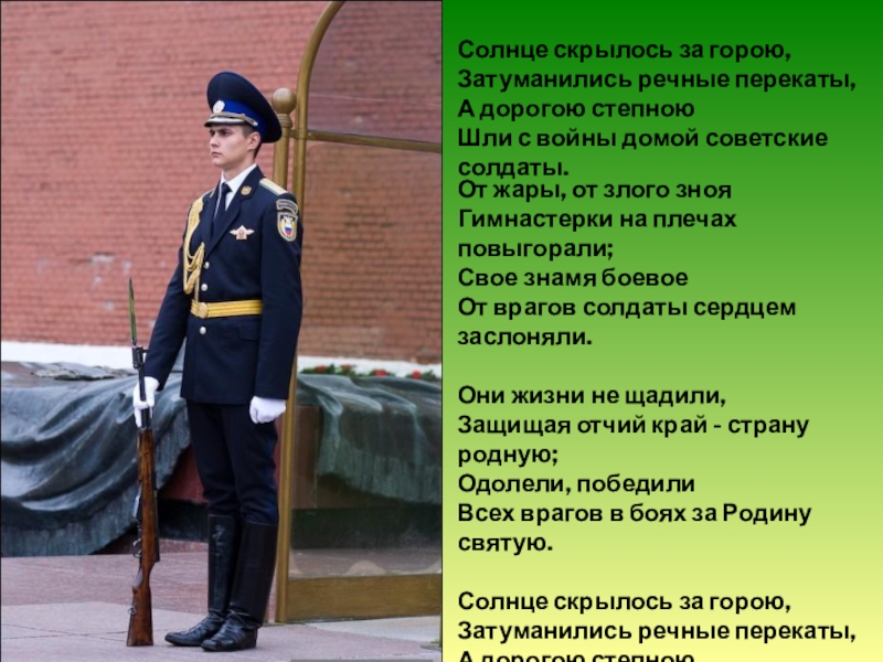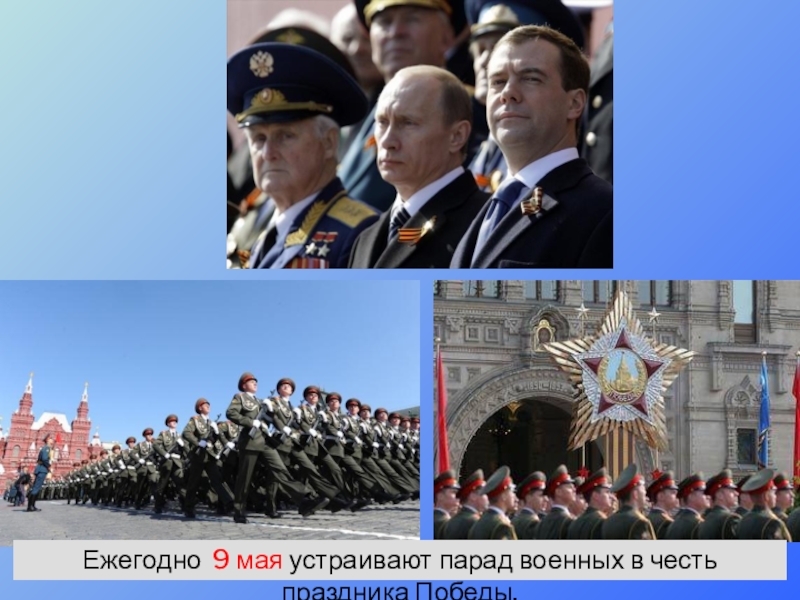 Слайд 12Ежегодно 9 мая устраивают парад военных в честь праздника Победы.