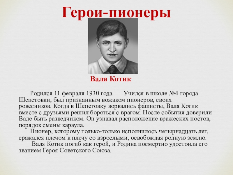 Шепетовки, был признанным вожаком пионеров, своих ровесников. Когда в Шепетовку ворвались фашисты, Валя Котик вместе с друзьями решил бороться с врагом. После события доверили Вале быть разведчиком. Он узнавал расположение вражеских постов, порядок смены караула.