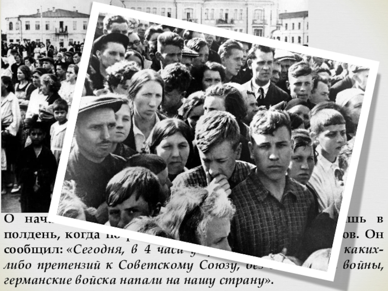 Слайд 5О начале войны советские граждане узнали лишь в полдень, когда по