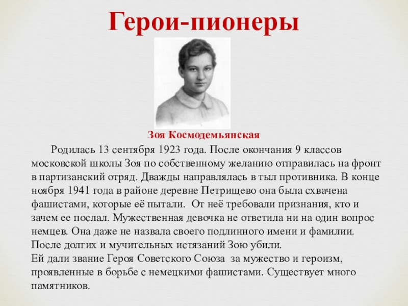 школы Зоя по собственному желанию отправилась на фронт в партизанский отряд. Дважды направлялась в тыл противника. В конце ноября 1941 года в районе деревне Петрищево она была схвачена фашистами, которые её пытали. От неё требовали признания, кто и зачем ее послал. Мужественная девочка не ответила ни на один вопрос немцев. Она даже не назвала своего подлинного имени и фамилии. После долгих и мучительных истязаний Зою убили.
