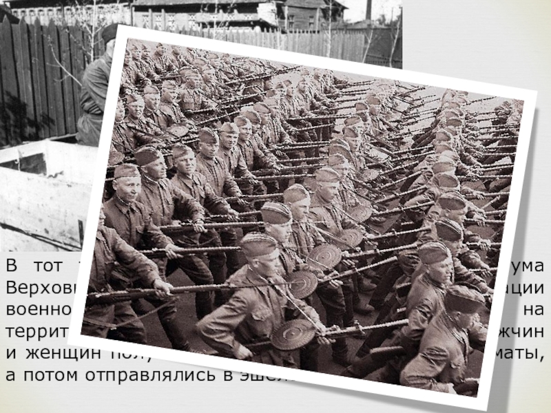 о мобилизации военнообязанных 1905-1918 годов рождения на территории всех военных округов. Сотни тысяч мужчин и женщин получали повестки, являлись в военкоматы, а потом отправлялись в эшелонах на фронт.