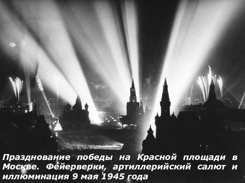 Слайд 16Празднование победы на Красной площади в Москве. Фейерверки, артиллерийский салют и