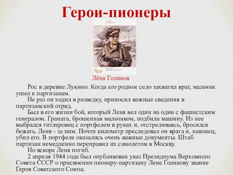 2 апреля 1944 года был опубликован указ Президиума Верховного Совета СССР о присвоении пионеру-партизану Лене Голикову звание Героя Советского Союза.