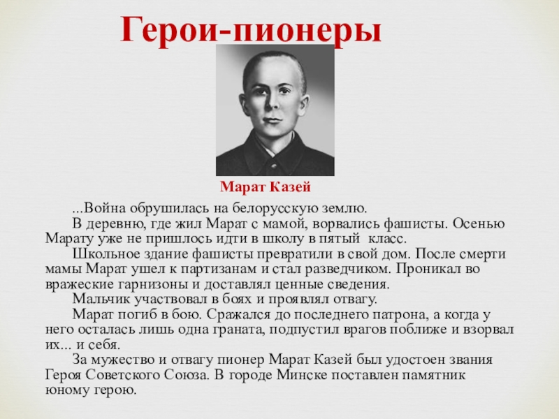 За мужество и отвагу пионер Марат Казей был удостоен звания Героя Советского Союза. В городе Минске поставлен памятник юному герою.