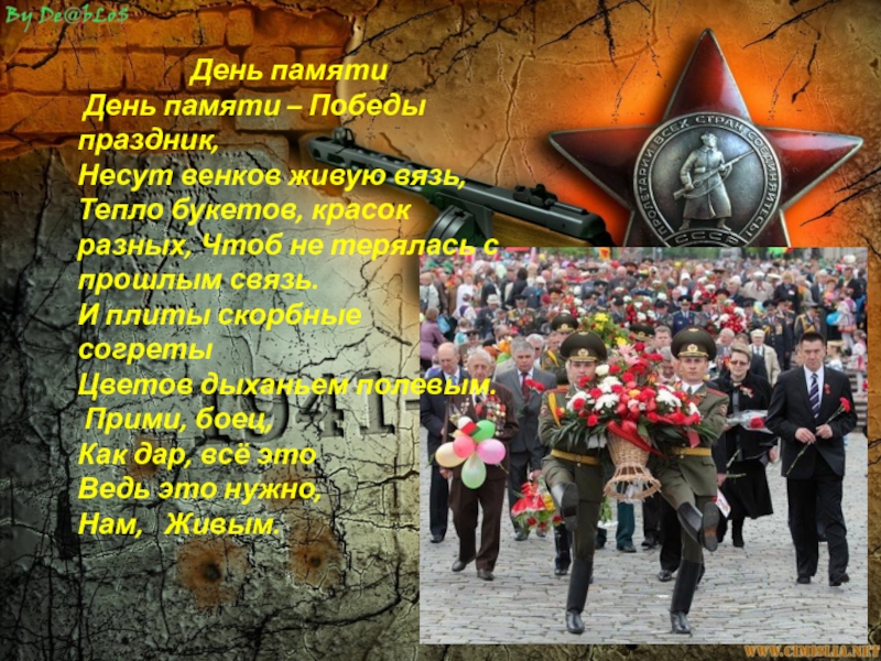 День памяти День памяти – Победы праздник,Несут венков живую вязь,Тепло букетов, красок разных, Чтоб не терялась с