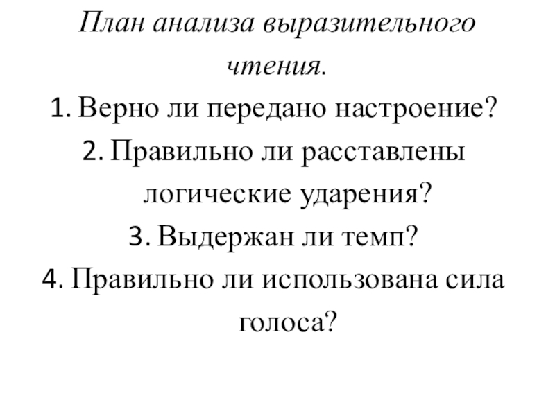 План анализа выразительного чтения.Верно ли передано настроение?Правильно ли расставлены логические ударения?Выдержан ли темп?Правильно ли использована сила голоса?