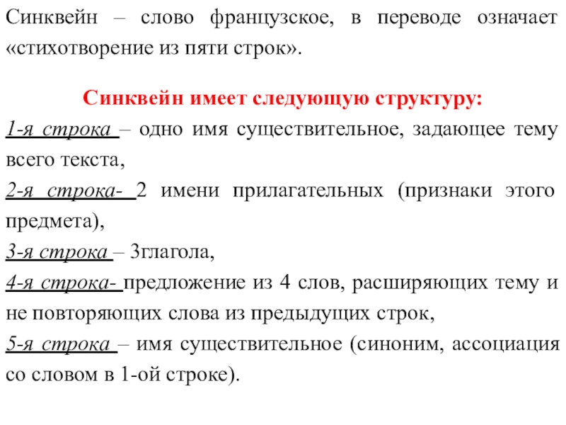 Синквейн – слово французское, в переводе означает «стихотворение из пяти строк».Синквейн имеет следующую структуру: 1-я строка –