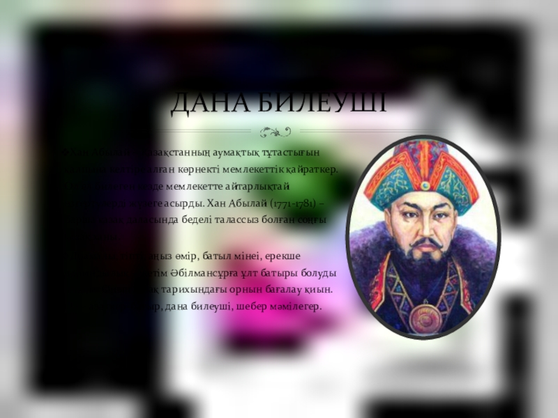 Слайд 8Абылай дарынды хан, аса ірі қайраткер, қолбасшы болды. Әбілмәмбет ханның тірі