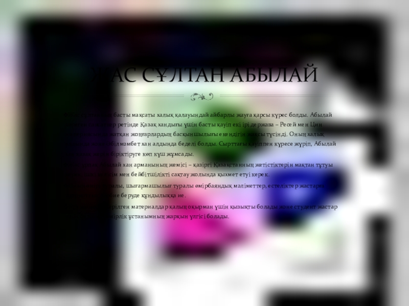 Слайд 7АБЫЛАЙ ХАННЫҢ ҚАЗАҚ ХАЛҚЫНА СІҢІРГЕН ЕҢБЕГІ