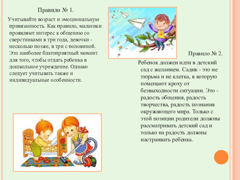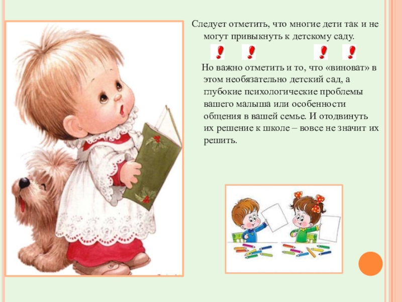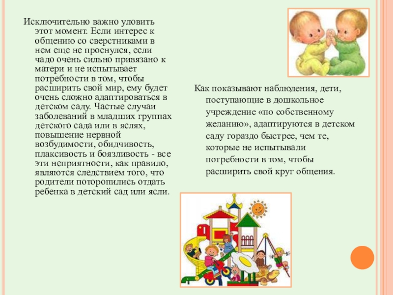Как показывают наблюдения, дети, поступающие в дошкольное учреждение «по собственному желанию», адаптируются в детском саду гораздо быстрее, чем те, которые не испытывали потребности в том, чтобы расширить свой круг общения.