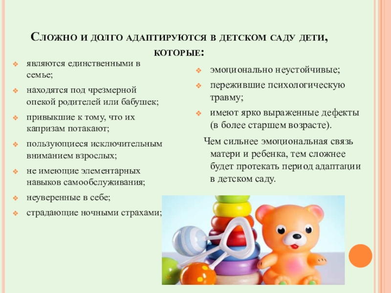 Чем сильнее эмоциональная связь матери и ребенка, тем сложнее будет протекать период адаптации в детском саду.