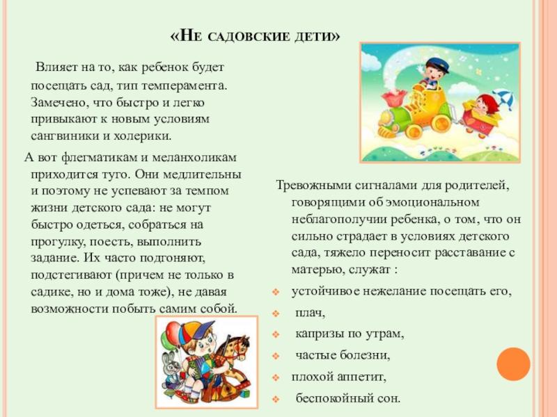 Тревожными сигналами для родителей, говорящими об эмоциональном неблагополучии ребенка, о том, что он сильно страдает в условиях детского сада, тяжело переносит расставание с матерью, служат :