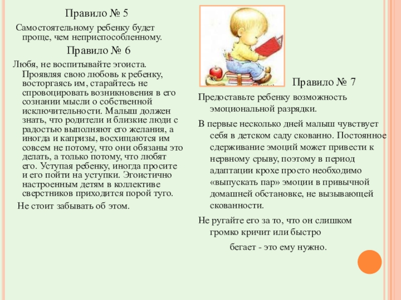 В первые несколько дней малыш чувствует себя в детском саду скованно. Постоянное сдерживание эмоций может привести к нервному срыву, поэтому в период адаптации крохе просто необходимо «выпускать пар» эмоции в привычной домашней обстановке, не вызывающей скованности.