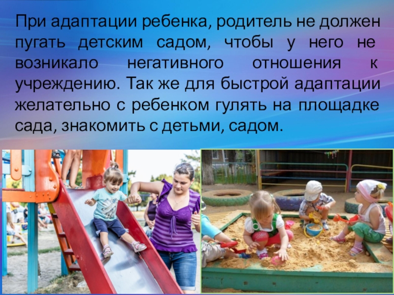 Слайд 6При адаптации ребенка, родитель не должен пугать детским садом, чтобы у