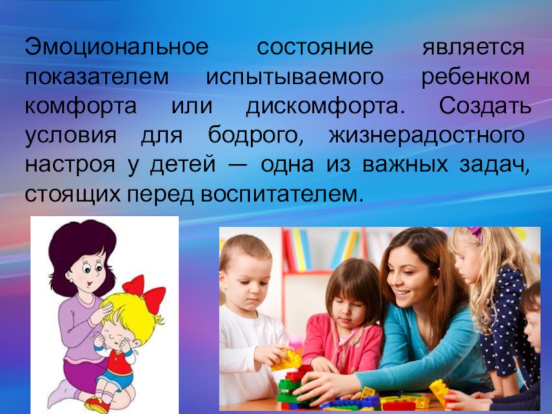 Эмоциональное состояние является показателем испытываемого ребенком комфорта или дискомфорта. Создать условия для бодрого, жизнерадостного настроя у детей