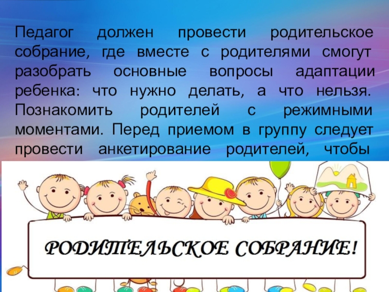 Педагог должен провести родительское собрание, где вместе с родителями смогут разобрать основные вопросы адаптации ребенка: что нужно