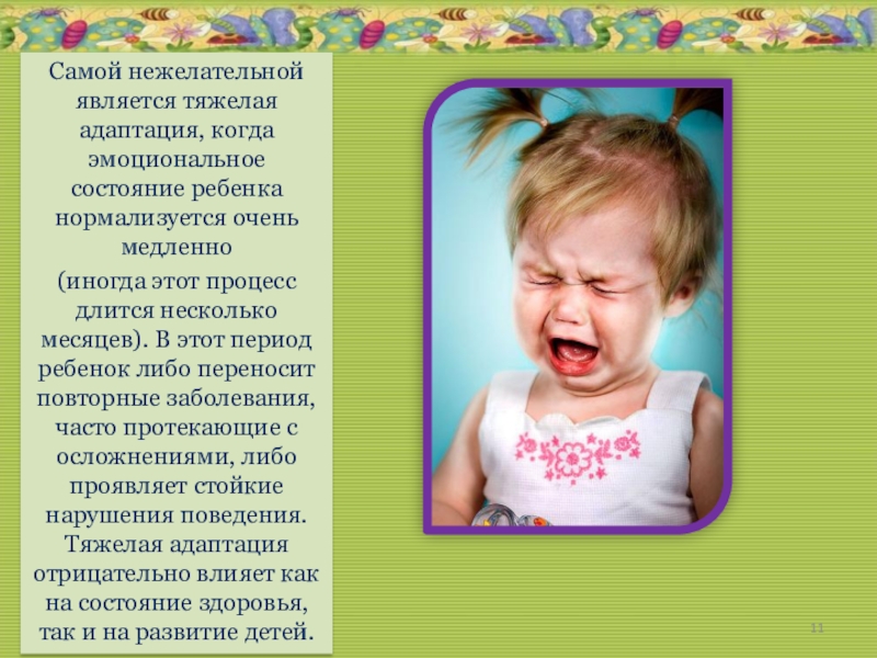 Слайд 11Самой нежелательной является тяжелая адаптация, когда эмоциональное состояние ребенка нормализуется очень