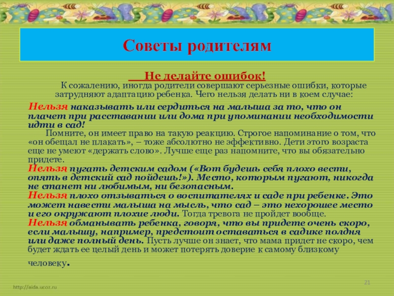 К сожалению, иногда родители совершают серьезные ошибки, которые затрудняют адаптацию ребенка. Чего нельзя делать ни в коем случае: