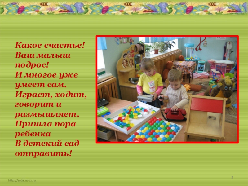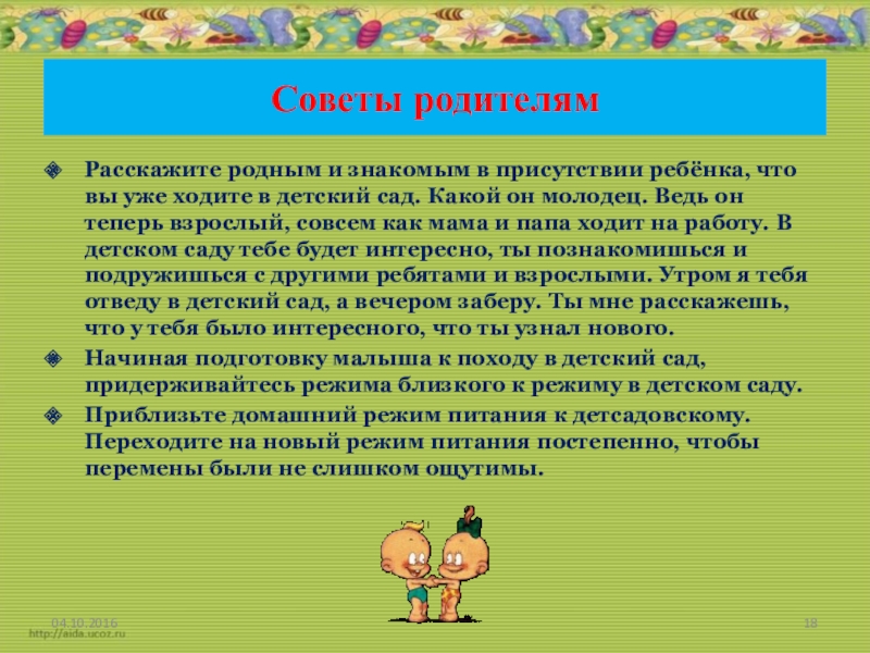 ходите в детский сад. Какой он молодец. Ведь он теперь взрослый, совсем как мама и папа ходит на работу. В детском саду тебе будет интересно, ты познакомишься и подружишься с другими ребятами и взрослыми. Утром я тебя отведу в детский сад, а вечером заберу. Ты мне расскажешь, что у тебя было интересного, что ты узнал нового.