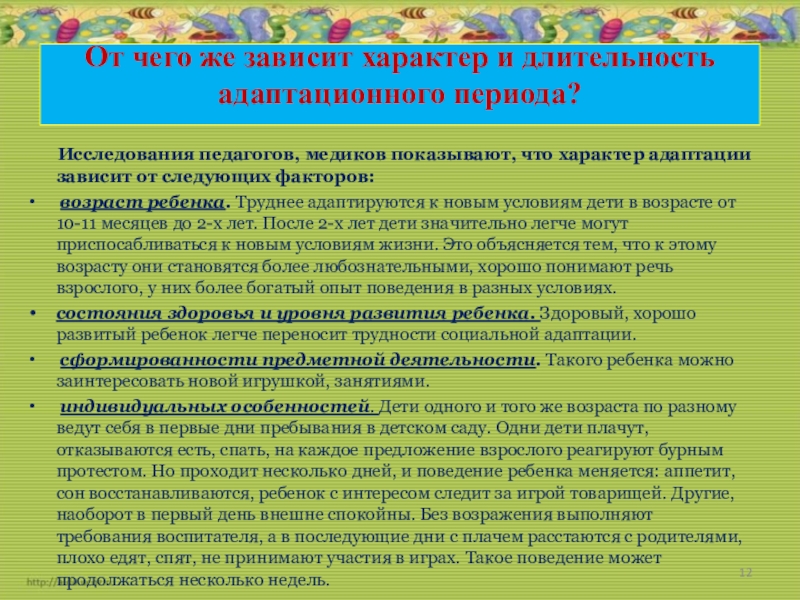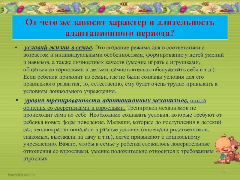 Слайд 14От чего же зависит характер и длительность адаптационного периода?