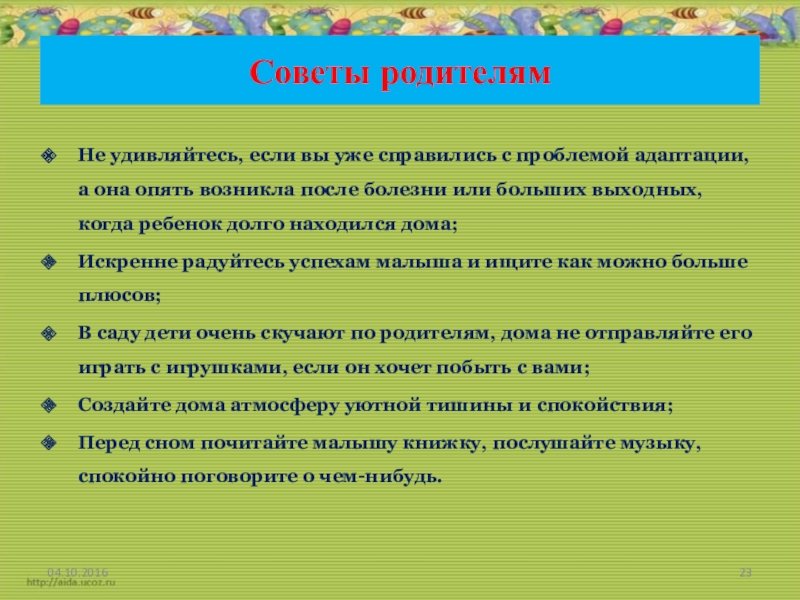 Нельзя плохо отзываться о воспитателях и саде при ребенке. Это может навести малыша на мысль, что сад – это нехорошее место и его окружают плохие люди. Тогда тревога не пройдет вообще.