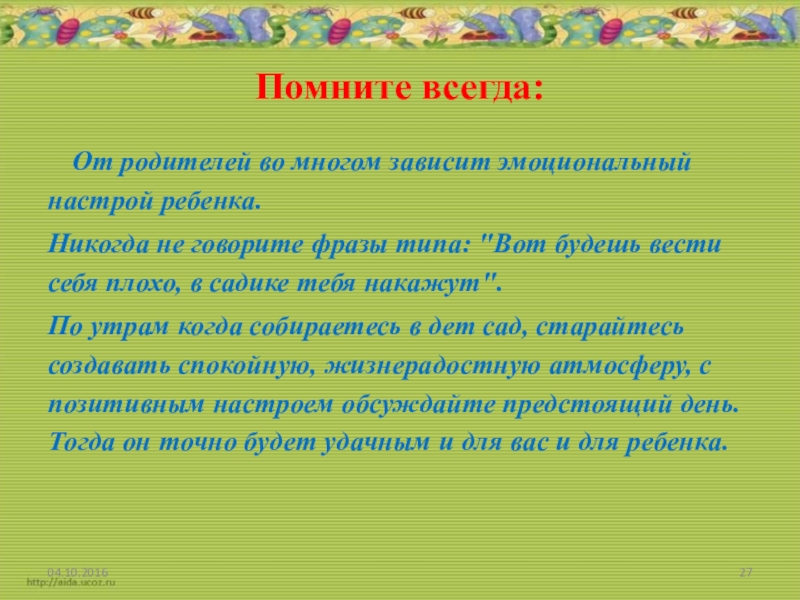 Никогда не говорите фразы типа: "Вот будешь вести себя плохо, в садике тебя накажут".