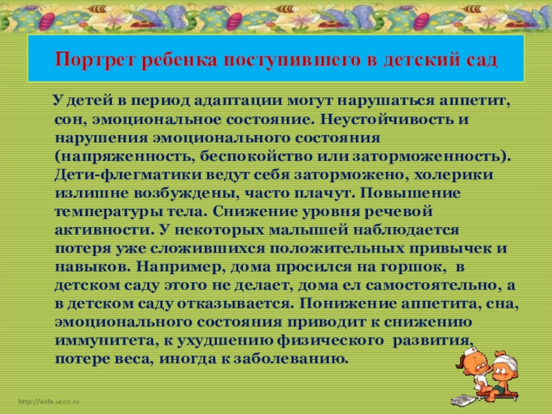 адаптации могут нарушаться аппетит, сон, эмоциональное состояние. Неустойчивость и нарушения эмоционального состояния (напряженность, беспокойство или заторможенность). Дети-флегматики ведут себя заторможено, холерики излишне возбуждены, часто плачут. Повышение температуры тела. Снижение уровня речевой активности. У некоторых малышей наблюдается потеря уже сложившихся положительных привычек и навыков. Например, дома просился на горшок, в детском саду этого не делает, дома ел самостоятельно, а в детском саду отказывается. Понижение аппетита, сна, эмоционального состояния приводит к снижению иммунитета, к ухудшению физического развития, потере веса, иногда к заболеванию.