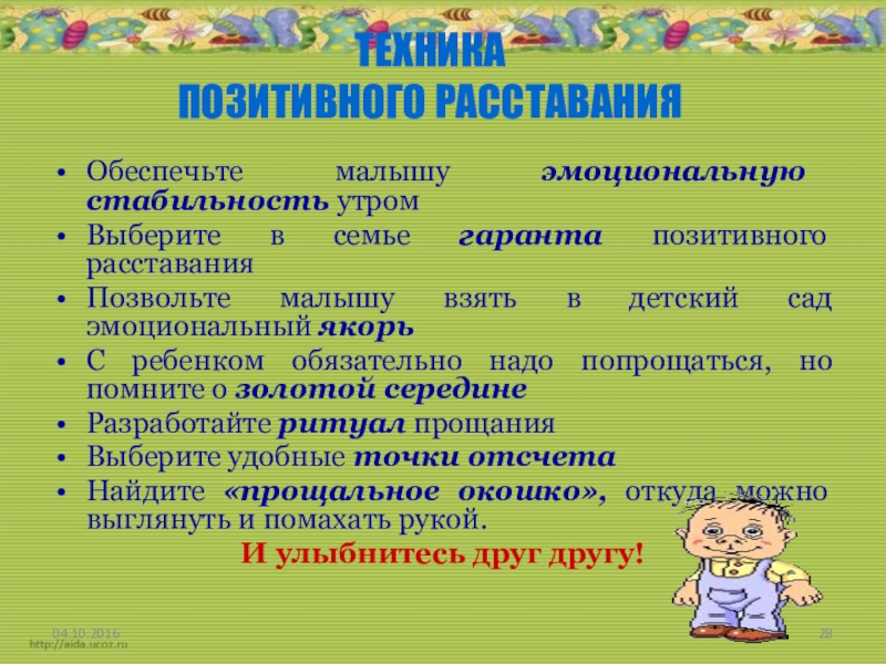 Расставание не следует затягивать, прощайтесь легко и быстро. Не вызывайте у ребёнка тревогу. Ваше спокойствие, уверенность, улыбка говорят малышу, что все в порядке и можно смело отправляться в группу.
