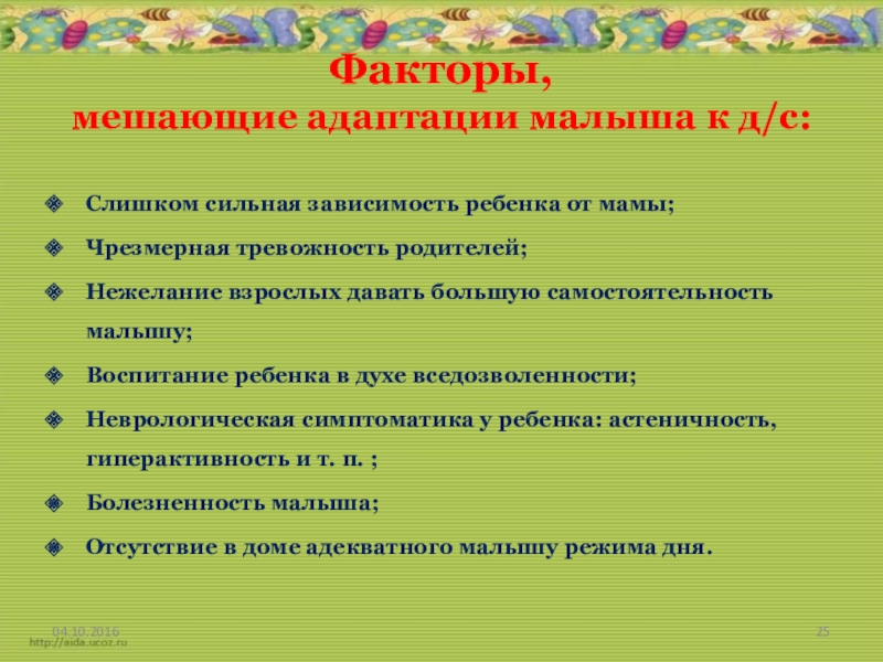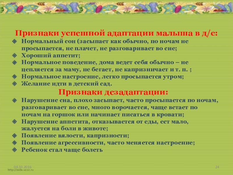 Слайд 24Признаки успешной адаптации малыша в д/с: