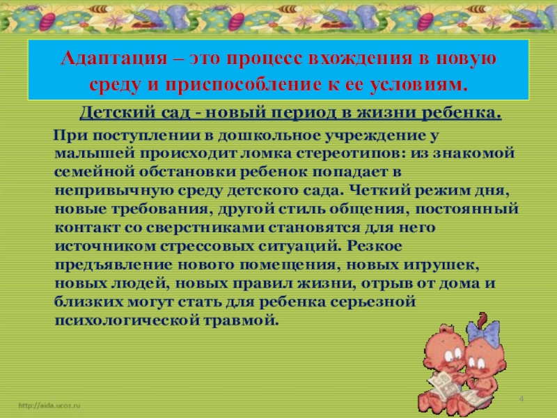 При поступлении в дошкольное учреждение у малышей происходит ломка стереотипов: из знакомой семейной обстановки ребенок попадает в непривычную среду детского сада. Четкий режим дня, новые требования, другой стиль общения, постоянный контакт со сверстниками становятся для него источником стрессовых ситуаций. Резкое предъявление нового помещения, новых игрушек, новых людей, новых правил жизни, отрыв от дома и близких могут стать для ребенка серьезной психологической травмой.