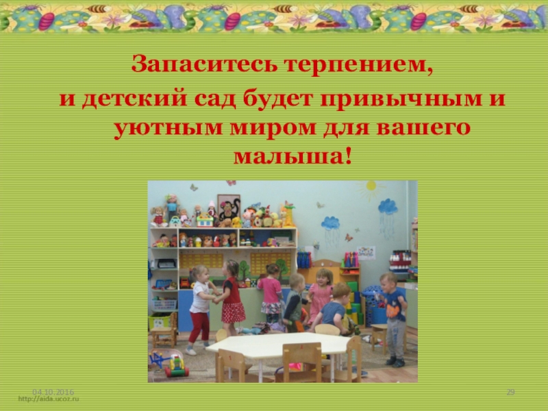 Нельзя пугать детским садом («Вот будешь себя плохо вести, опять в детский сад пойдешь!»). Место, которым пугают, никогда не станет ни любимым, ни безопасным.