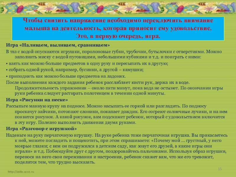 Чтобы снизить напряжение необходимо переключить внимание малыша на деятельность, которая приносит