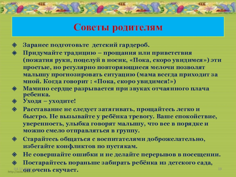 (пожатия руки, поцелуй в носик, «Пока, скоро увидимся») эти простые, но регулярно повторяющиеся мелочи позволят малышу прогнозировать ситуацию (мама всегда приходит за мной. Когда говорит : «Пока, скоро увидимся!»)