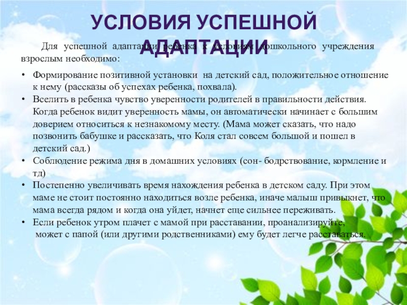 Вселить в ребенка чувство уверенности родителей в правильности действия. Когда ребенок видит уверенность мамы, он автоматически начинает с большим доверием относиться к незнакомому месту. (Мама может сказать, что надо позвонить бабушке и рассказать, что Коля стал совсем большой и пошел в детский сад.)