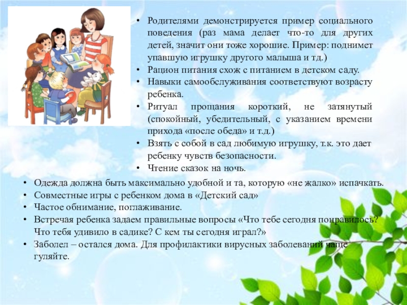 Формирование позитивной установки на детский сад, положительное отношение к нему (рассказы об успехах ребенка, похвала).