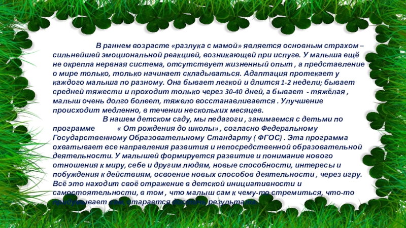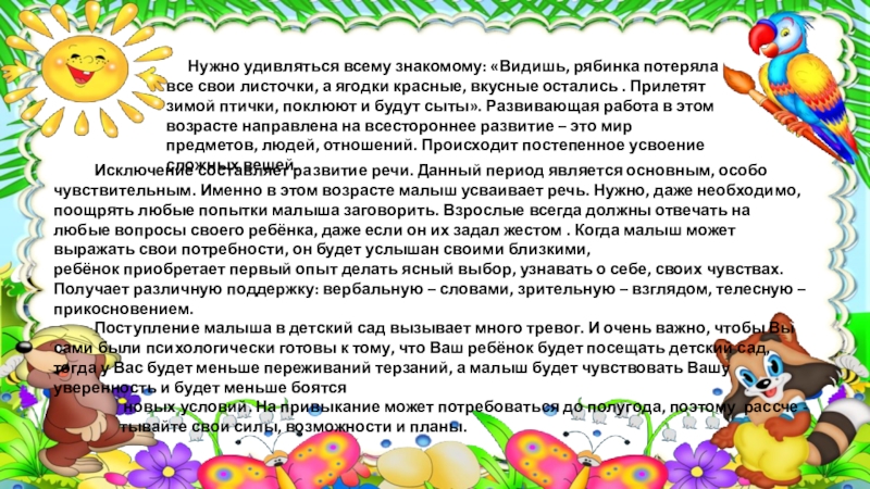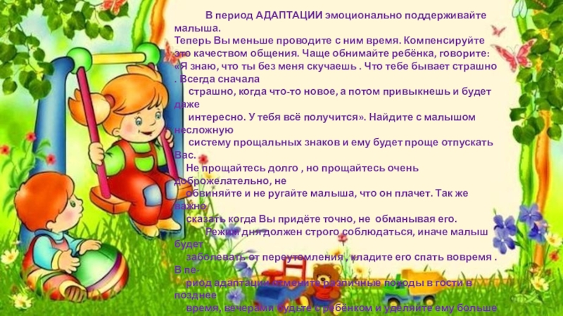 Поступление малыша в детский сад вызывает много тревог. И очень важно, чтобы Вы сами были психологически готовы к тому, что Ваш ребёнок будет посещать детский сад, тогда у Вас будет меньше переживаний терзаний, а малыш будет чувствовать Вашу уверенность и будет меньше боятся