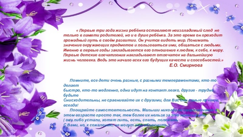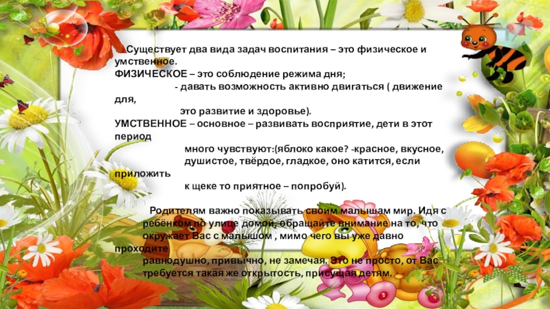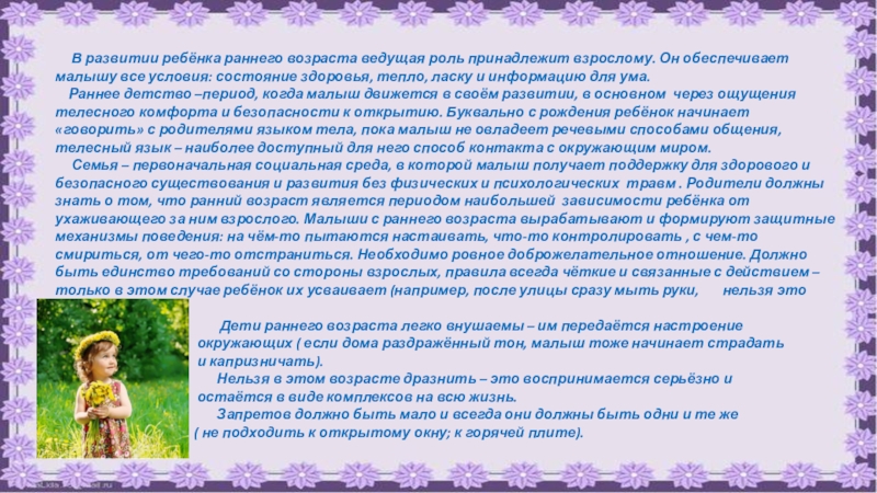 ребёнок приобретает первый опыт делать ясный выбор, узнавать о себе, своих чувствах. Получает различную поддержку: вербальную – словами, зрительную – взглядом, телесную – прикосновением.