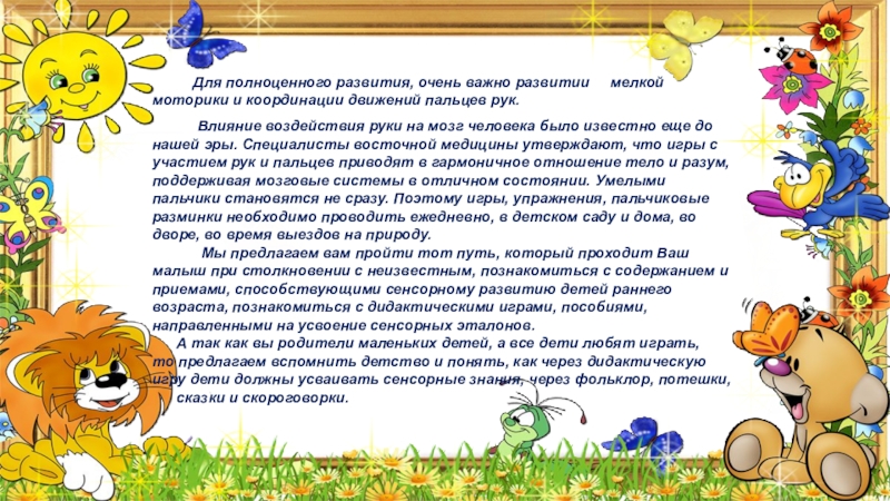 А так как вы родители маленьких детей, а все дети любят играть, то предлагаем вспомнить детство и понять, как через дидактическую игру дети должны усваивать сенсорные знания, через фольклор, потешки,