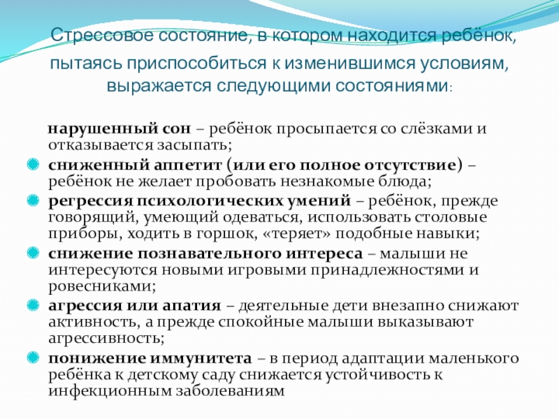 Стрессовое состояние, в котором находится ребёнок, пытаясь приспособиться к изменившимся условиям, выражается следующими состояниями: