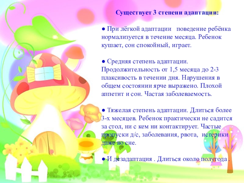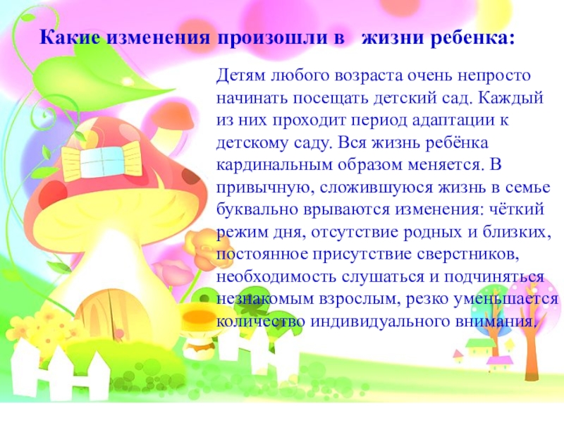 непросто начинать посещать детский сад. Каждый из них проходит период адаптации к детскому саду. Вся жизнь ребёнка кардинальным образом меняется. В привычную, сложившуюся жизнь в семье буквально врываются изменения: чёткий режим дня, отсутствие родных и близких, постоянное присутствие сверстников, необходимость слушаться и подчиняться незнакомым взрослым, резко уменьшается количество индивидуального внимания.