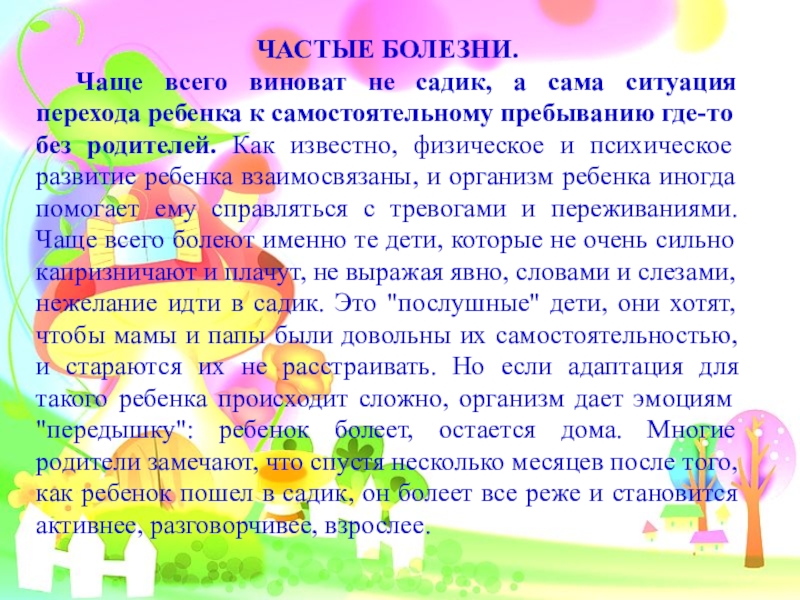 перехода ребенка к самостоятельному пребыванию где-то без родителей. Как известно, физическое и психическое развитие ребенка взаимосвязаны, и организм ребенка иногда помогает ему справляться с тревогами и переживаниями. Чаще всего болеют именно те дети, которые не очень сильно капризничают и плачут, не выражая явно, словами и слезами, нежелание идти в садик. Это "послушные" дети, они хотят, чтобы мамы и папы были довольны их самостоятельностью, и стараются их не расстраивать. Но если адаптация для такого ребенка происходит сложно, организм дает эмоциям "передышку": ребенок болеет, остается дома. Многие родители замечают, что спустя несколько месяцев после того, как ребенок пошел в садик, он болеет все реже и становится активнее, разговорчивее, взрослее.