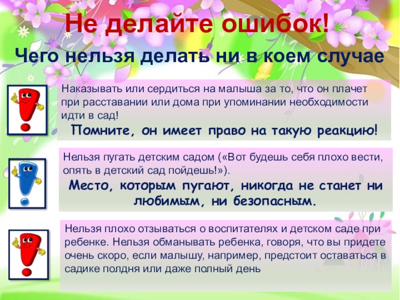 Нельзя плохо отзываться о воспитателях и детском саде при ребенке. Нельзя обманывать ребенка, говоря, что вы придете очень скоро, если малышу, например, предстоит оставаться в садике полдня или даже полный день