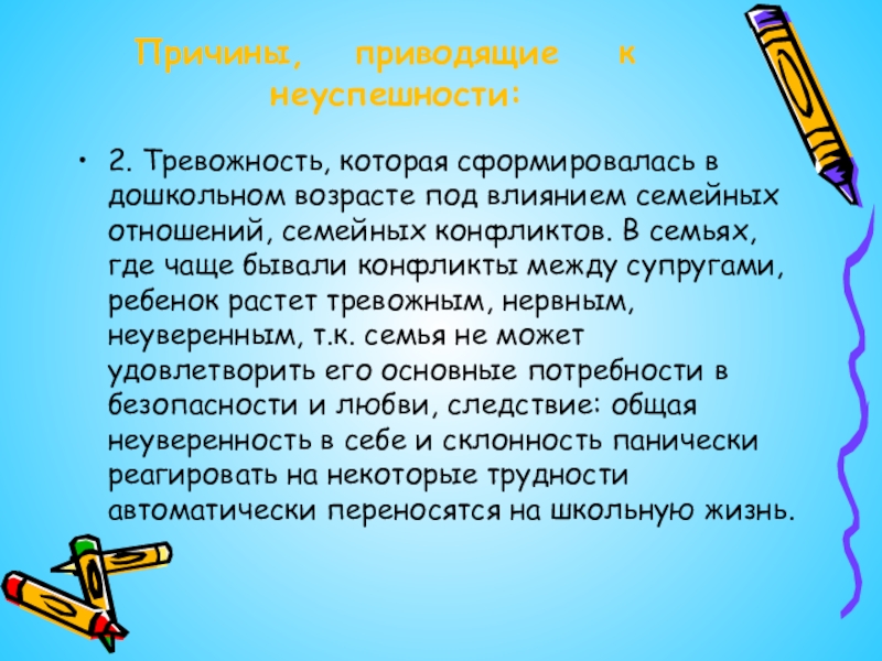 влиянием семейных отношений, семейных конфликтов. В семьях, где чаще бывали конфликты между супругами, ребенок растет тревожным, нервным, неуверенным, т.к. семья не может удовлетворить его основные потребности в безопасности и любви, следствие: общая неуверенность в себе и склонность панически реагировать на некоторые трудности автоматически переносятся на школьную жизнь.