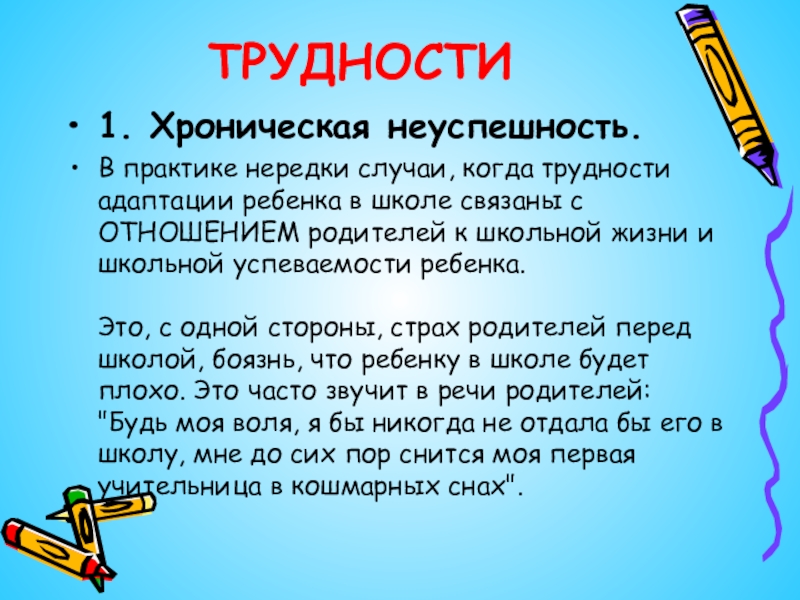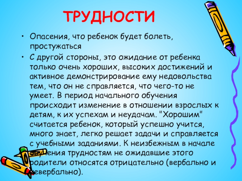 ребенка только очень хороших, высоких достижений и активное демонстрирование ему недовольства тем, что он не справляется, что чего-то не умеет. В период начального обучения происходит изменение в отношении взрослых к детям, к их успехам и неудачам. "Хорошим" считается ребенок, который успешно учится, много знает, легко решает задачи и справляется с учебными заданиями. К неизбежным в начале обучения трудностям не ожидавшие этого родители относятся отрицательно (вербально и невербально).