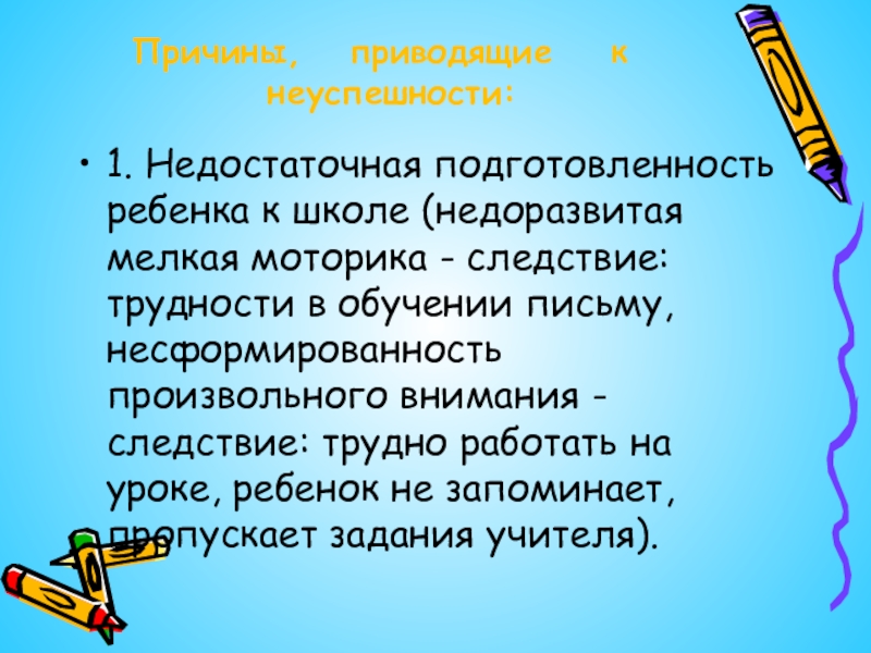 1. Недостаточная подготовленность ребенка к школе (недоразвитая мелкая