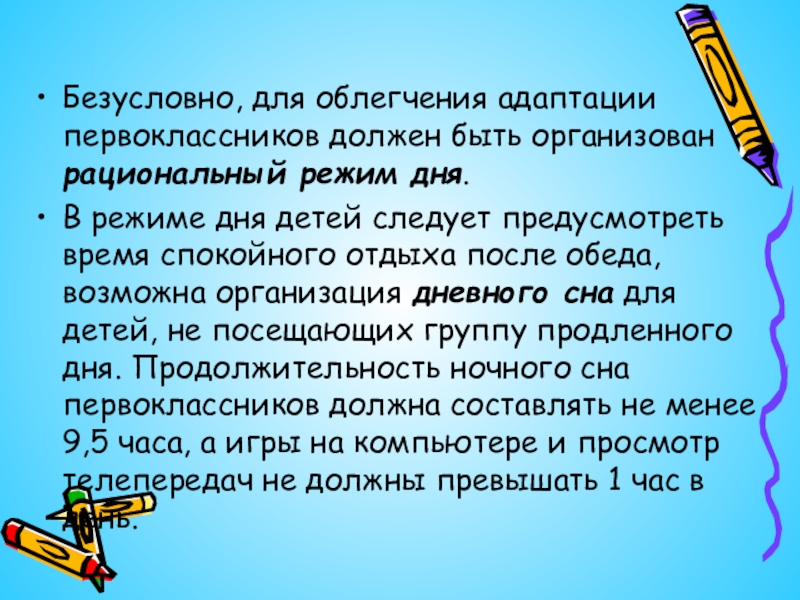 режиме дня детей следует предусмотреть время спокойного отдыха после обеда, возможна организация дневного сна для детей, не посещающих группу продленного дня. Продолжительность ночного сна первоклассников должна составлять не менее 9,5 часа, а игры на компьютере и просмотр телепередач не должны превышать 1 час в день.