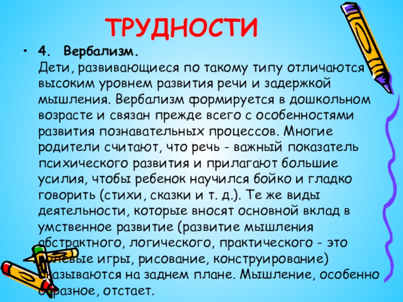 речи и задержкой мышления. Вербализм формируется в дошкольном возрасте и связан прежде всего с особенностями развития познавательных процессов. Многие родители считают, что речь - важный показатель психического развития и прилагают большие усилия, чтобы ребенок научился бойко и гладко говорить (стихи, сказки и т. д.). Те же виды деятельности, которые вносят основной вклад в умственное развитие (развитие мышления абстрактного, логического, практического - это ролевые игры, рисование, конструирование) оказываются на заднем плане. Мышление, особенно образное, отстает.